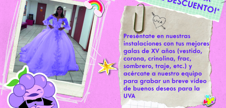 50% de descuento en todos los talleres talleres si vines vestidx para la fiesta de XV años de la UVA y nos compartes una felicitación para nuestras redes