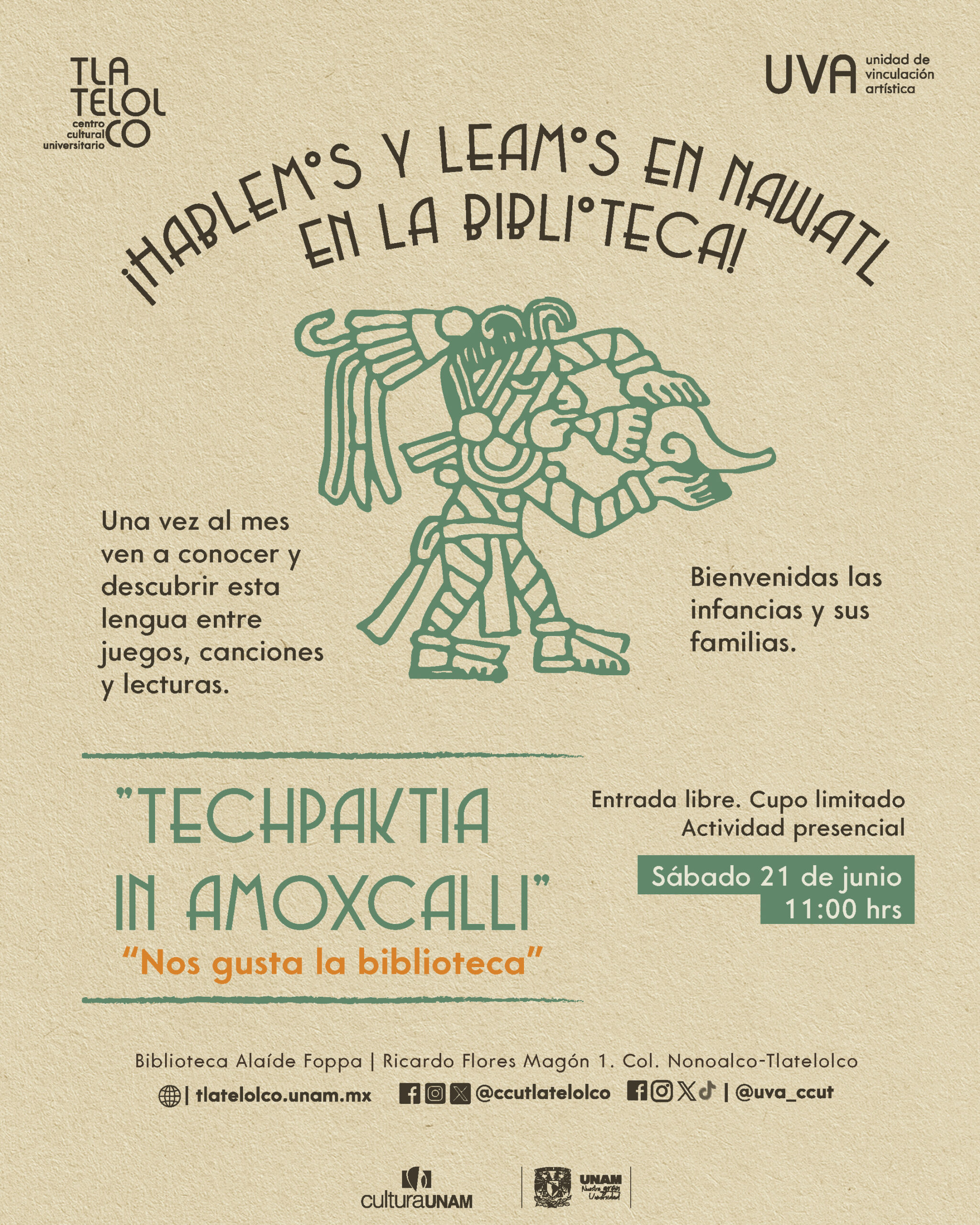 Unidad de Vinculación Artística Ricardo Flores Magón #1, Col. Nonoalco-Tlatelolco, Ciudad de México, Ciudad de México, MexicoReunión mensual (parte del bloque infantil "Crecer entre libros") para compartir aprendizajes y lecturas en lengua nawatl con el público …