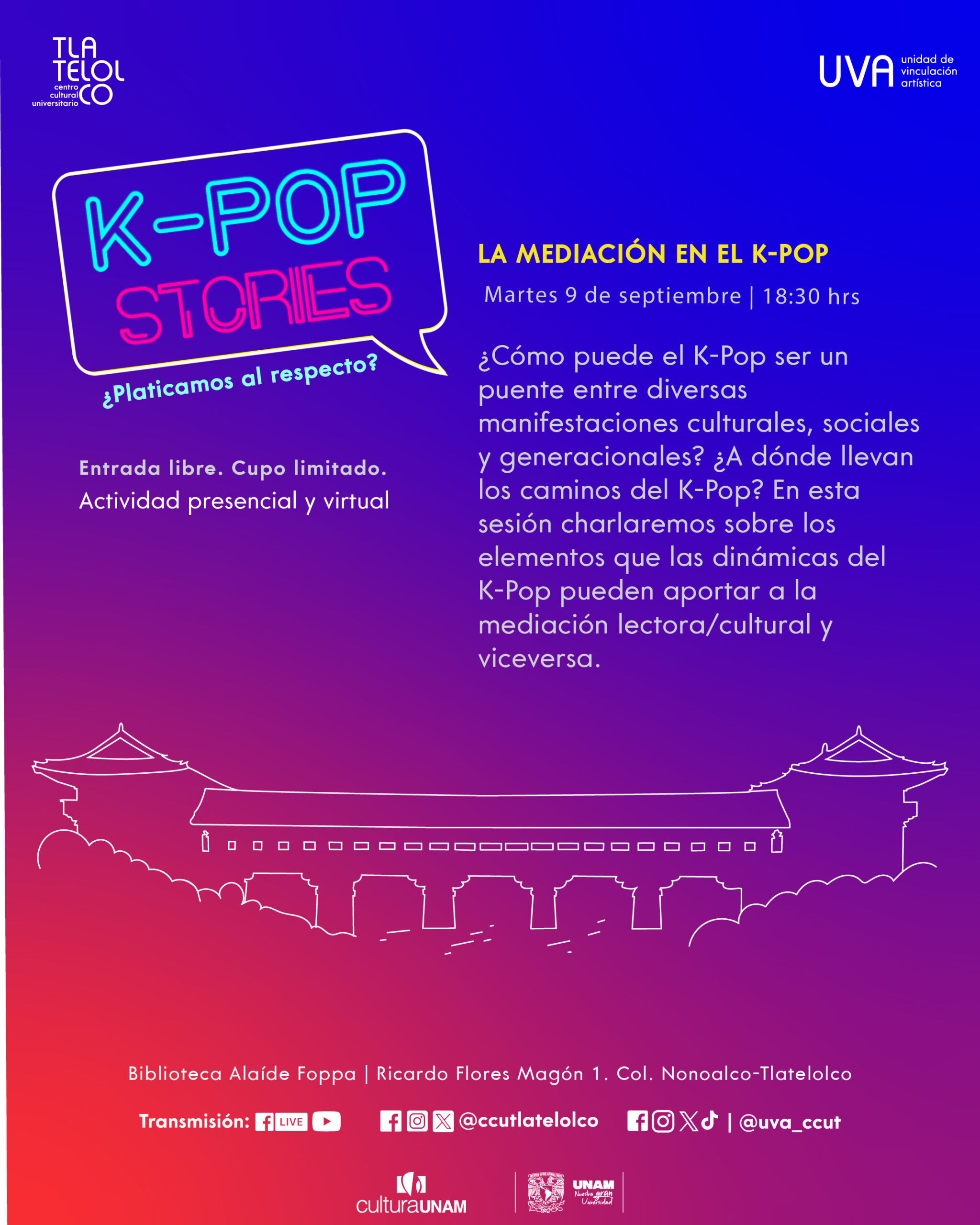 Unidad de Vinculación Artística Ricardo Flores Magón #1, Col. Nonoalco-Tlatelolco, Ciudad de México, Ciudad de México, MexicoSesión dedicada a identificar las posibilidades de mediación cultural y lectora del K-Pop. ¡Únete a nuestro Discord: https://discord.gg/uTcWU6SKu6!